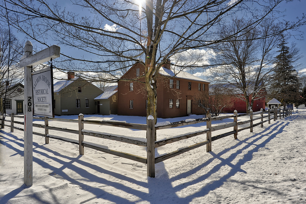 Long shadows emphasize the fences surrounding the Salmon Brook Historical Society on this crisp, clear winter day. Photo by Peter Dinella