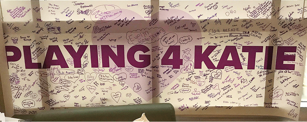 After the game, parents took the “Playing for Katie” banner to other local basketball travel games so players and fans could sign it. Now filled with hundreds of signatures (including Lobo’s), the banner hangs in Katie’s hospital room– and was one of the first things she saw when she came out of her coma. It serves as a focal point for young Katie as she bravely navigates the long road of her recovery.