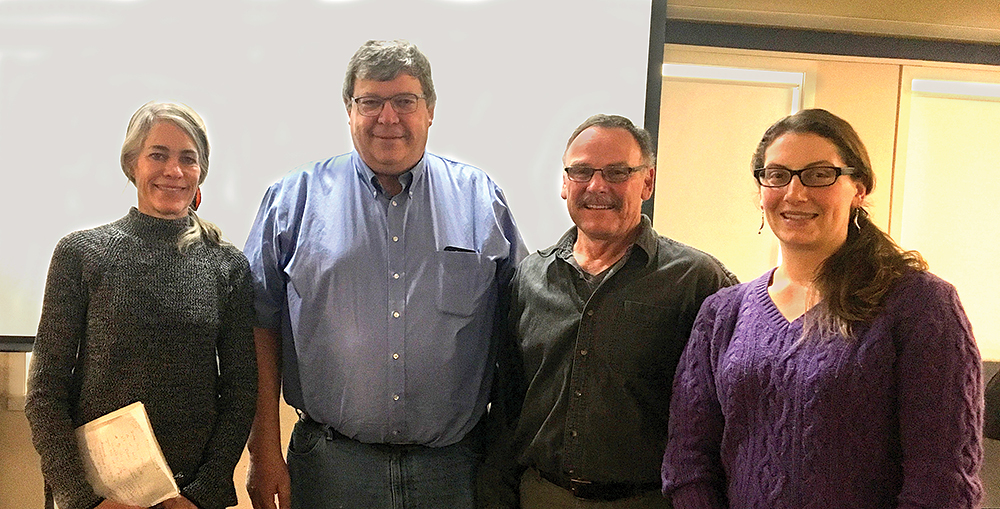 The Granby Land Trust partnered with the Simsbury Land Trust and Holcomb Farm to sponsor a local showing of the documentary film Forgotten Farms on March 11. Nearly 75 people turned out to see the film and learn more about the challenges New England dairy farmers face today. The film’s producer, Sarah Gardner (left), an associate director of the Center for Environmental Studies at Williams College, moderated a panel discussion after the film. Don Tuller of Tulmeadow Farm in West Simsbury (second from left) and Granby’s own dairy farmers Stanley Hayes and his daughter, Ellen Hayes Whitlow, served on the panel, as well. Photo by Amy Zeiner, Simsbury Land Trust