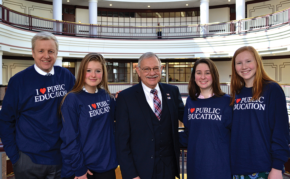 Between meetings and public hearings, State Representative Bill Simanski (R-62) guided three Granby high school students, Madeline Attianese, Sarah Cussano and Lindsay Gilton and Superintendent Alan Addley on a tour of the Legislative Office Building and the State Capitol. The students and their superintendent were at the Capitol for CABE’s (Connecticut Association of Boards of Education) A Day on the Hill to advocate for Connecticut public schools. Rep. Simanski also took the students behind the public spaces to show the students where the legislators work and explained how a bill proposal moves through the process to become a law. Above: from l.: Superintendent Alan Addley, Madeline Attianese, Rep. Simanski, Sarah Cussano and Lindsay Gilton.