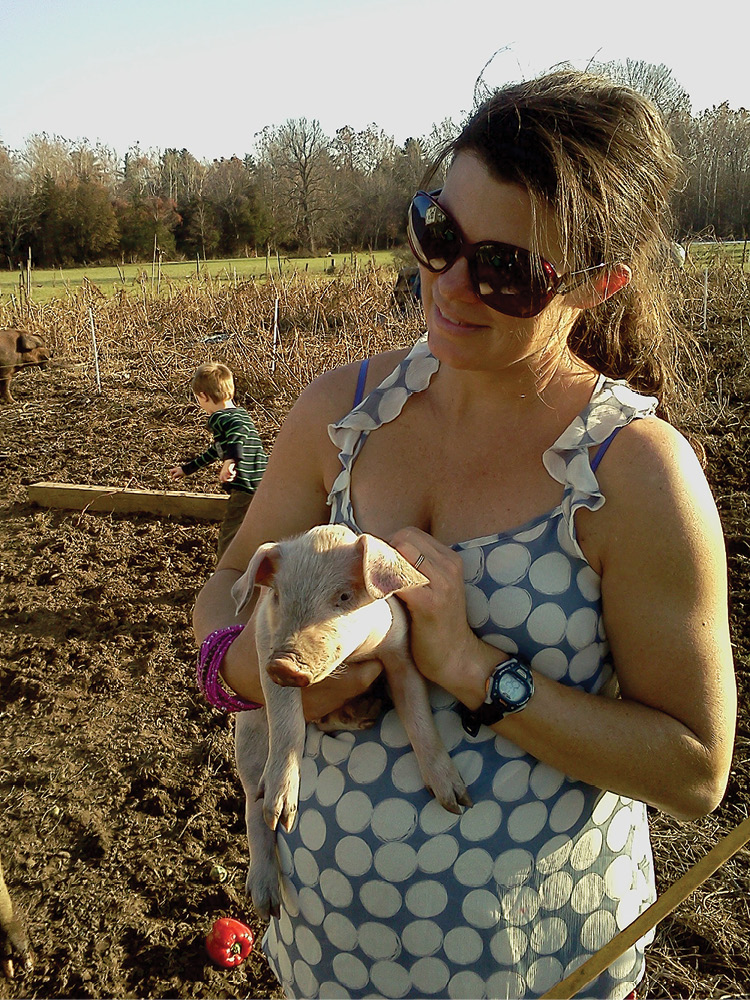 Farmer Kate and a piglet.