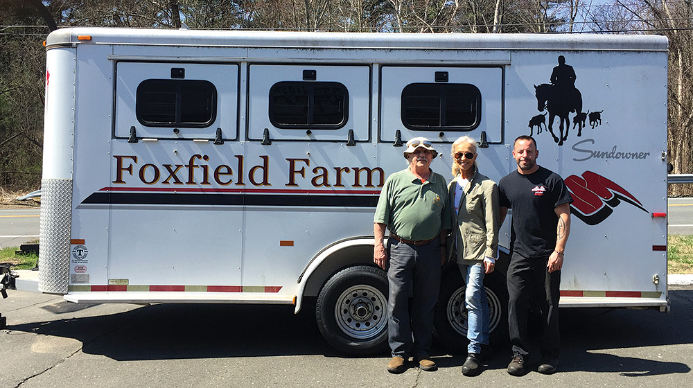 Bill Regan and Susan Patricelli-Regan of Foxfield F.A.R.M. Charity and Nick Miller, Checkered Flag shop manager. Checkered Flag is a generous contributor to Foxfield F.A.R.M. with a donation of “in kind” trailer service to the farm’s horse rescue program that is the cornerstone of the PTSD equine therapy curriculum. Visit foxfieldrecoverymission.org for more information and to donate.
