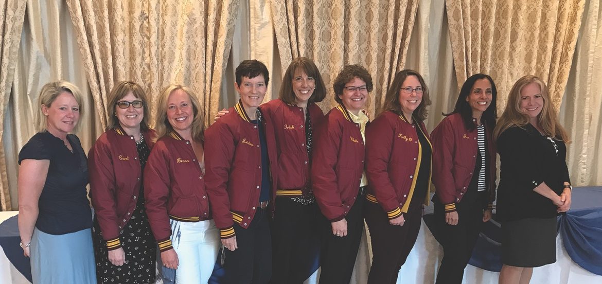 Legendary Granby Field Hockey Coach Dot Johnson recently was honored at the Connecticut Sportwriters’ Alliance Gold Key Dinner. Some of her former players from her 1980, 1982 and 1985 teams were there to surprise and honor her, including (from l.): Laura (Barnas) Paro, Carol (Christensen) Lorenzo, Elaine Brassard, Kristen (Schupp) Cormier, Trish Percival, Sue Fullwood, Kelly (O’Meara) Rome, Jen (Papagna) Braunmiller, and Sandy (Kenoian) Nilson.
