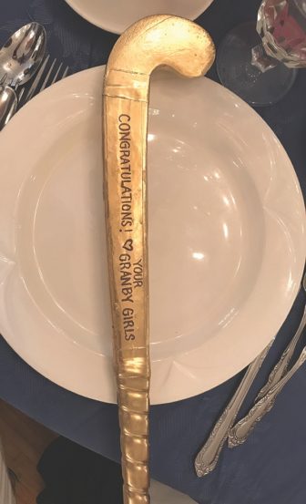 Following the ceremony, we presented Miss J with some gifts, on behalf of everyone who ever played for her—maroon and gold pansies, a miniature golden field hockey stick and a cap bearing her career record. They were small gifts, but you know what they say—it’s the thought that counts. In this case, the thought was this: “Thank you, Miss J, for all you did for us, on and off the field. Thank you for teaching us to be strong women. And thank you for giving us a field hockey family that lives on, all these years later. We were proud to play for you.”