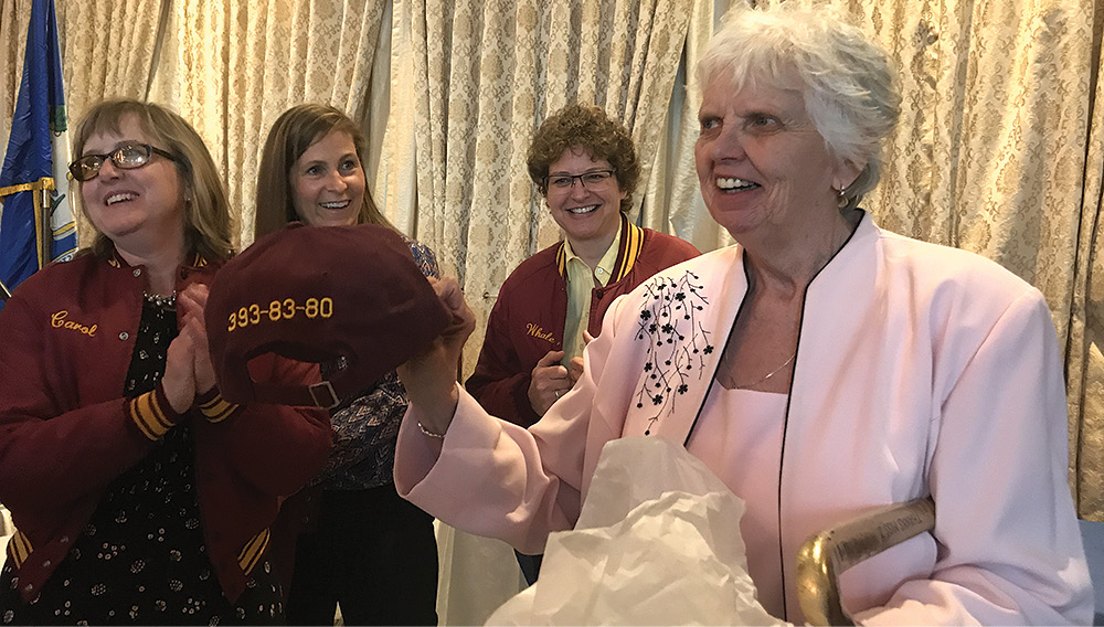 A group of Coach Dot Johnson’s former players presented her with a cap bearing her incredible overall winning record, attained over 34 years of coaching field hockey at Granby Memorial High School (393 wins, 83 ties, and 80 losses – a .779 winning percentage). Pictured here, from left to right: Carol (Christensen) Lorenzo, Carolyn (Sarr) Sheehan, and Sue Fullwood.