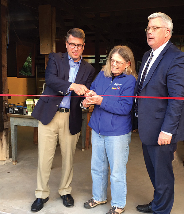 The ribbon cutting was performed by, from l., Friends of Holcomb Farm Board President Bob Bystrowski, Selectman Sally King and Town Manager John Ward.
