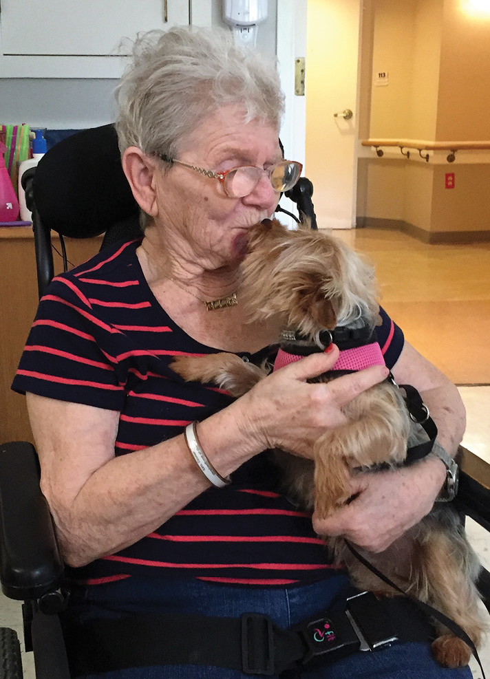 Patients often say that this dog therapy visit “is better medicine than anything that comes in a bottle”. On a recent visit, “Bella”, a two-year-old Yorkie bred and raised by the Regans, met with Ellie Katz, a MeadowBrook resident.