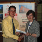 Kathy Norris, president of the Citizens for a Better Granby, presents Tim Nolan with the Granby Drummer scholarship.