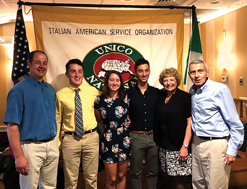 The Granby chapter of UNICO awarded four college scholarships of $2,000 each to graduating seniors from Granby. Photo (from left) at a recent dinner recognizing the recipients and their parents: Granby chapter President Rob Gangi, scholarship winners Timothy Nolan (Syracuse), Sarah Cusano (UConn) and Ethan Schock (WPI), President-Elect and scholarship presenter Joy Marx and Scholarship Committee chairman Mario Dei Dolori. Not present is scholarship winner Heather Salter (U. Delaware). UNICO is the nation’s largest Italian-American service organization and the Granby chapter has been awarding scholarships since receiving its charter in 2003.