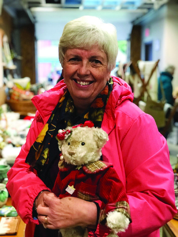 Considering competition from the rain, it was decided to re-open on Sunday. Intermittent visitors stopping by after church or on a Sunday drive did not leave empty-handed. One customer paid for Ruby-rimmed punch bowl and cups (still available). Ellen Cunha, director of sales Jean Potetz, the society’s curator of textiles, takes bear home. and loaded four bar stools, a large metal grill and three vintage standing lamps into her SUV. Then she bought a pair of earrings.