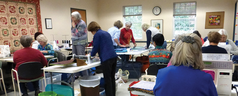 Come to the Granby Senior Center one Wednesday of every month and you will hear multiple sewing machines going at break-neck speed and dozens of cheery voices bantering back and forth. As you draw near, you see colorful fabrics being cut, sliced, sewn, turned and tweaked. On ironing boards in the back, the fabrics are being smoothed and pressed, the steam of irons puffing as they glide.
