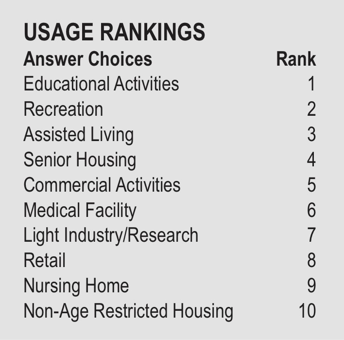 The center concept was addressed among survey preferred usages—Community Center was not among survey categories. The usage table ranks the surveyed preferences.