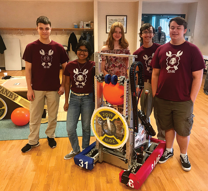 From l.: Paxton Diaz, Dwaritha Ramesh, Katrina McCord, Prior Waskin and James Accetura pose with their 2019 creation, Buggin the robot. Submitted photo