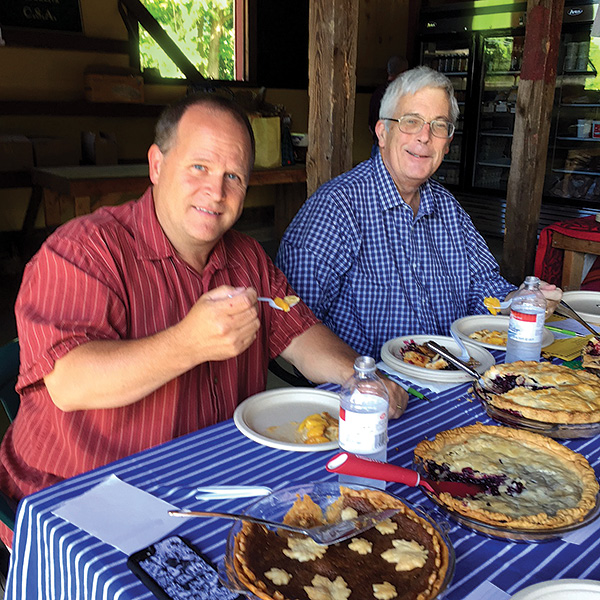 How ya gonna keep ‘em down on the farm? Give ‘em pie! The Friends of Holcomb Farm held its annual meeting on Sunday, June 9. It included a pie judging contest, after which the edible entries were eagerly consumed by the attending members. Pies were judged by Town Manager John Ward and First Selectman Scott Kuhnly, who sampled each before declaring Susan Canavan’s blueberry entry the winner. A mixed berry and a maple pie took second and third places.
