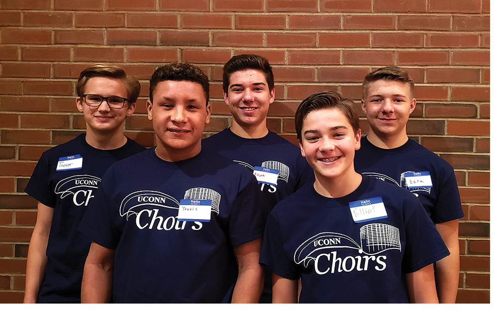 GMHS singers attended the UCONN Brothers Sing On Festival on Saturday, Oct. 14 under the baton of Dr. Jamie Spillane. Pictured: back row from l: Trevor Thompson, Elijah Holt, Ezra Holt; front: Travis Reid and Elliot Hosack. Photo by Mindy Shilansky