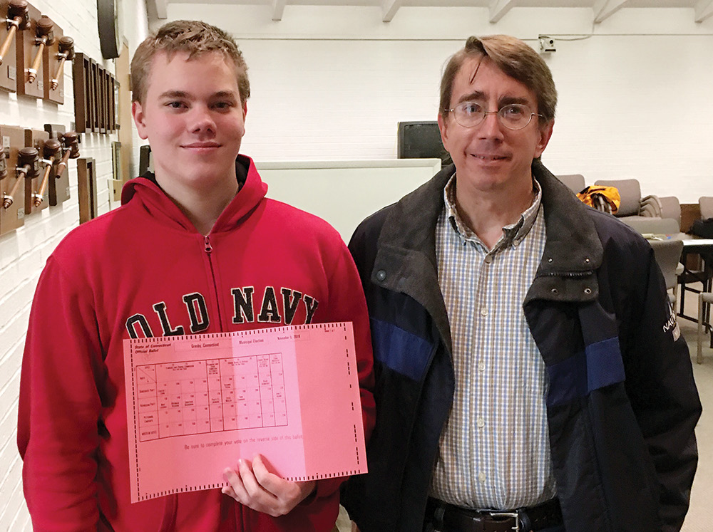 Granby’s youngest voter in the Nov. 5 election was Zachary Yoder, pictured at left with his dad, Merle. Zachary used Election Day Registration (note the cherry red ballot) because at the regular registration deadline of Oct. 29 he was still 17. Submitted photo