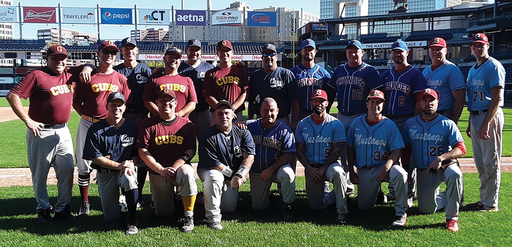 The third annual Connecticut North Men’s Senior Baseball League (CNMSBL) All-Star game was held on Sunday, Sept. 15, at Dunkin Donuts Park in Hartford. After a several hour rain delay, four Granby Cubs players and one coach represented the team at this year’s game. Hazen Sturtevant, Jason Mele, Jonathan Gentile, and Chris Mele were voted by their teammates to represent their team in the game and Mike Agogliati was selected as a coach representative. The Cubs played on the Americans team with other players from the Rocky Hill/Newington Caps, the Colchester Thunder, and the Bristol Mustangs. Together the team jumped out in front with seven runs in the first inning and never looked back, winning the game 8-2. This game is the CNMSBL’s biggest fundraiser and all proceeds from the game were donated to the league’s charity Wounded Warriors. The Granby Cubs thanks its 2019 “double” and “triple” sponsors: Signature Flight Support, Tim’s Automotive, Route 10 Tire, Carmon Funeral Home, and Beacon Mechanical Services. Submitted photo