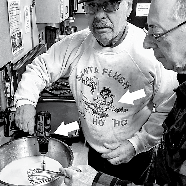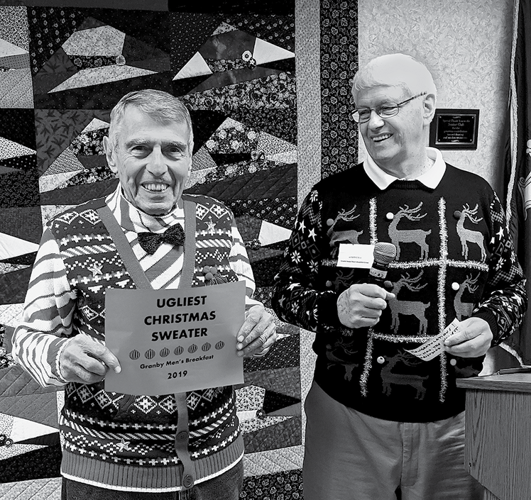 People Granby men enjoy breakfast and holiday fun at December meeting By Granby Drummer | February 1, 2020 ShareTweet EmailPrint More More on People Subscribe to People Photo by Nat Kennedy The GMHS chorus, under the direction of Mindy Shelansky, performs for the men’s breakfast bunch. Mario DeiDolori, left, wins the Ugly Christmas Sweater contest. President Duncan Rowles presented the award. Once an engineer, always an engineer. Don Rethke employs a power drill and a potato peeler to mix the egg slurry for French toast. Yum!