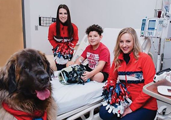 Leonbergers, such as Yulee, are particularly well-suited as therapy dogs. They weigh up to 170 pounds and can be over 30” tall. A lush-coated giant breed of German origin, they exude a gentle demeanor and pervasive serenity well suited to providing companionship in many situations. They bask in companionship with people, sitting or standing patiently for longer times than most dogs would. Yulee is so tall that patients can pet him right at their bed or chairside; his gentle nature encourages physical interaction.