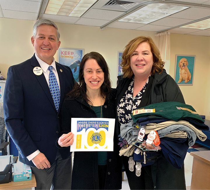 (Right to left) Lion Audrey Lampert, school nurse Kelly Santos, and past district governor Dave Roberts who delivered the new pants. Submitted photo.
