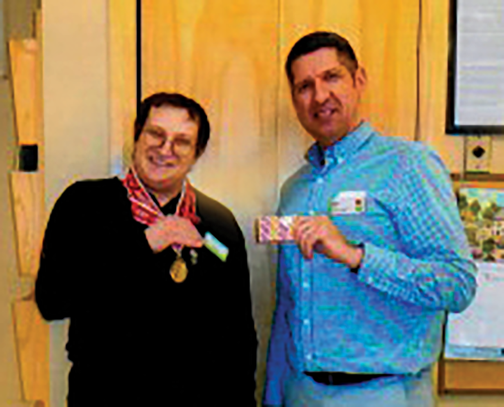 Dan Skinner (left), a long-time employee at Granby’s Stop & Shop, is congratulated by store manager Angel Cruz for the medals he won in the Connecticut Winter Special Olympics. Skinner won a gold and two silver medals.