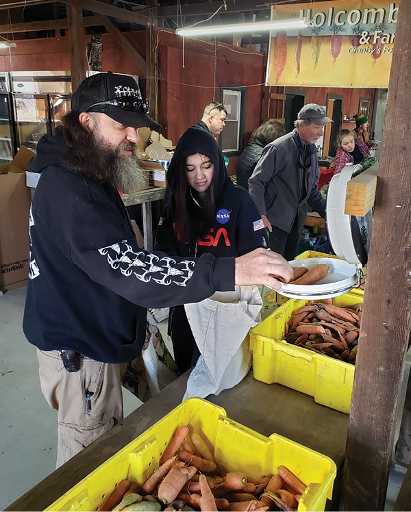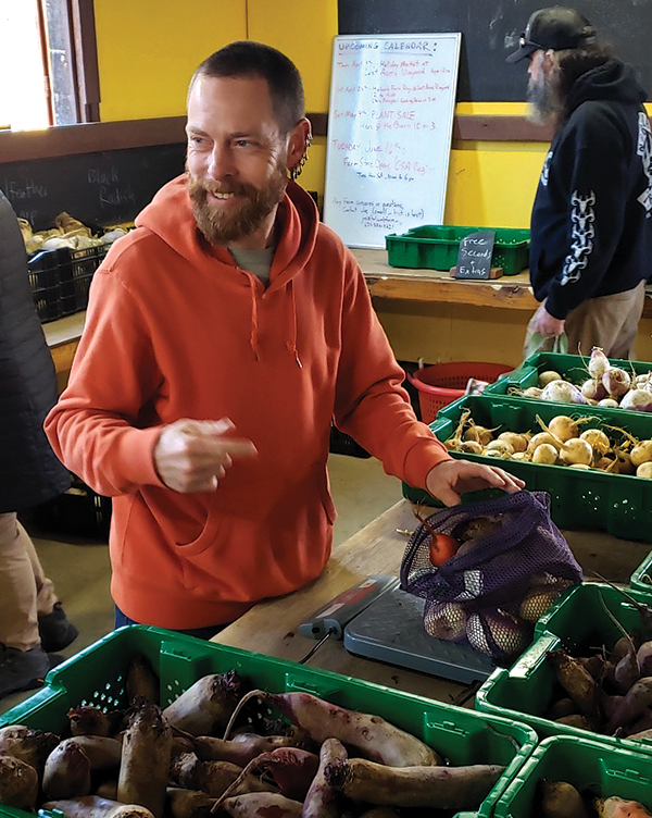 Todd Crevier discovers that Holcomb Farm’s supply of carrots remains bountiful. Photo by Jesse Parker Justin Avery weighs his bounty from the St. Paddy’s day Flash Market. The market was ripe with winter vegetables and fresh greens. Photo by Jesse Parker