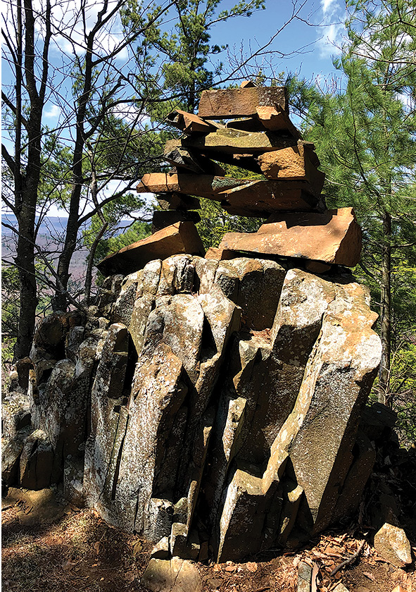 A hike on the Metacomet Trail brings many rewards but finding art is not what one would expect. This cairn-like installation is on the trail north of Newgate, near Suffield.