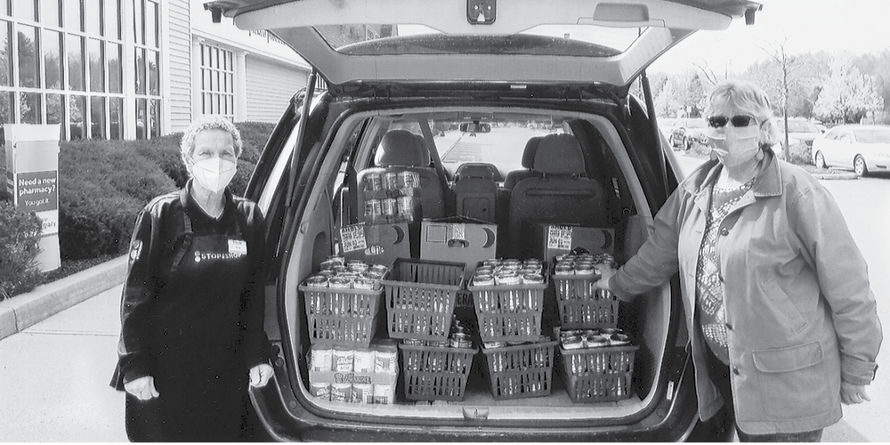 Rosia Kennedy (l.) and Sandy Flagg with one of three car loads full of food donated by Granby Stop & Shop patrons. The food was given to the Waste Not, Want Not kitchen that feeds more than 200 people each Wednesday. “This program is dear to my heart,” says Kennedy.