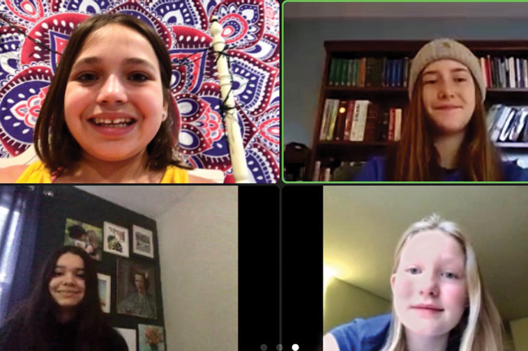 On a Zoom call. Top, from l.: Izabella Therion and Addie Zinck; bottom: Adelyn Sanzo and Lillie Zinck. Submitted photo