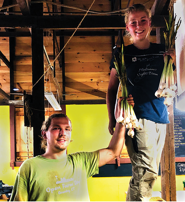 Caleb Lagan helps his sister Sarah hang the harvested garlic in the barn at Holcomb Farm to dry.
