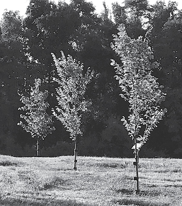 These three elm trees are on the Tree Trail at Holcomb Farm. All three were planted in October 2018, and have grown several feet since. They are an American Elm cultivar called ‘Princeton’, which is resistant to Dutch Elm Disease. The same cultivars are planted at the White House.