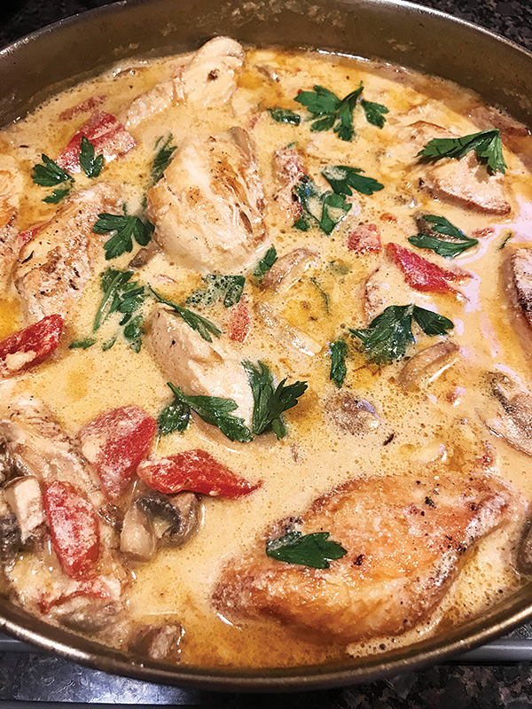 I know we are heading into turkey season, but this month I have another fantastic chicken dish that will warm you up and dazzle your tastebuds on these cold fall nights. You can serve this over pasta or zucchini noodles or with mashed potatoes to soak up the sauce. Either way it’s a winner.
