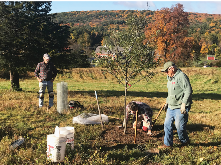 The Holcomb Tree Trail volunteers also completed the annual fall planting on Oct. 17, adding seven new trees to the trail, including one of each of the following: Amur Maackia, Yellowwood, Bald Cypress, Hornbeam, Hophornbeam, Eastern Redbud, and Ginkgo. All these trees were planted in Hillside Field, except for the Hophornbeam, which was planted on the eastern edge of Hilltop Field, the CSA’s potato crop field. We also planted three Zelkova Schmidtlow cultivars, a gift from the Friends of Holcomb Farm, in the grassy area between the farmhouse and North Barn at the main farm complex, to replace the ailing birch that was removed earlier this year.