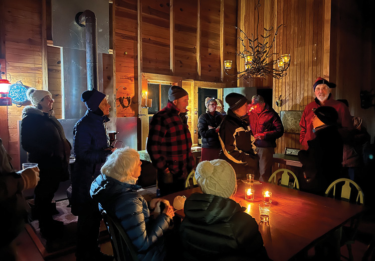 In mid-December, Dave Emery led a full moon hike on the Granby Land Trust’s Dismal Brook Wildlife Preserve. A group of 30 GLT members joined Dave for a beautiful night in the woods, then finished the evening with Christmas cookies and hot cocoa by candlelight at the Glazier Cabin. Here, longtime GLT Board Member Put Brown is seen sharing a brief history of the cabin with all in attendance. Photo by Michael Puskar
