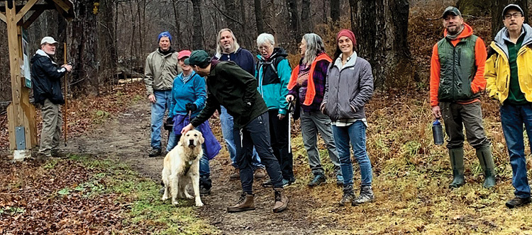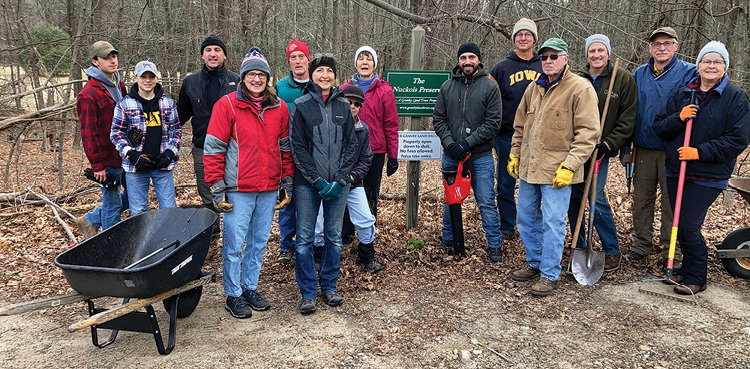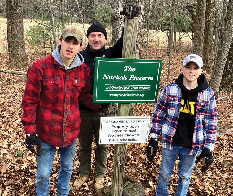 A group of enthusiastic and dedicated Granby Land Trust members contributed their time and energy to clean-up the Nuckols Family Preserve on Simsbury Road in West Granby during an early December morning GLT Trail Workday. GLT Property Stewards Holly and Curt Johnson, along with GLT VP Dave Emery, led the effort that included tidying up the trail that leads to a beautiful view of the Salmon Brook. Photo by Dave Emery