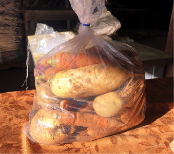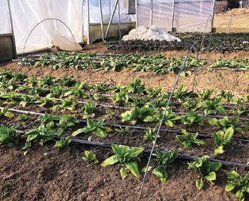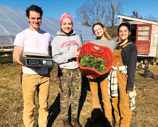 Farmer Joe returned to the barn from checking out the property on the big tractor. “Way too muddy out there,” he proclaimed! The spinach tastes as wonderful as it looks. Emma’s chickens couldn’t believe their fortune to be able to spend the afternoon sunning in their yard. They were talking up a storm, with no social distancing. Hot peppers hung for drying maintained a little holiday spirit in the barn. The parking lot will soon be cleared of the many piles of wood chips donated by the Asplundh arborists when they cleared power lines during the winter. The material will be used to mulch present and future perennials all over the Farm. Bags of winter veggies being prepared for sale. The biggest job of the day was replacing the plastic covering of one of the hot houses. David Spatcher and Justin Avery did a fabulous job. Raising the side for ventilation worked perfectly. From l., David Spatcher, Michelle Dingivan, Hanna Malzenski and Melody Smith harvested spinach to be washed and weighed for packaging.