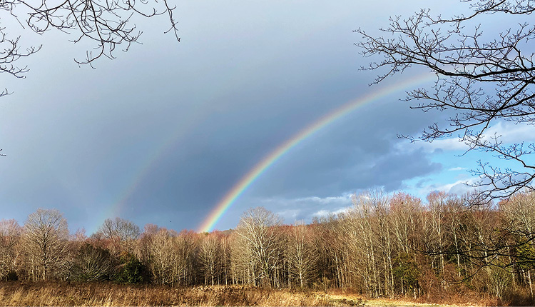 This double rainbow over the Pease Family Preserve is a reminder to pause and give thanks to Bill and Jane Ann Pease, charter members of the Granby Land Trust, who looked out on this view for 60 years before their passing in 2013. An attorney, Bill served as the GLT’s first legal counsel at the GLT’s founding. Jane Ann was a chemistry teacher at Granby Memorial High School for 25 years. After their passing, Bill and Jane Ann’s children, Sarah and Marty, donated 58 acres of their parents’ land to the Granby Land Trust, in keeping with their parents’ wishes. We are so grateful to them for preserving this beautiful piece of land that abuts other GLT-preserved land in the Old Messenger Road Corridor. This spectacular rainbow was photographed by Rick Orluk. Please see other news and photos from The Granby Land Trust on p. 18.