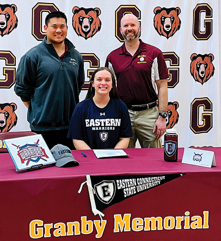 March 15 was a special day for Granby Memorial High School senior Elizabeth Squier as she signed her commitment letter to Eastern Connecticut State University. Elizabeth was admitted not only for her academic standing, but also for her considerable volleyball skills. In fact, she has been assigned #11 on the volleyball team. Along with her parents and her teammates and their families, her volleyball coaches joined in the celebration in the high school gymnasium. Pictured with Elizabeth are (l.) Brian Liu, assistant coach and Dave Sprowson, head coach. Photo by Katie Murach