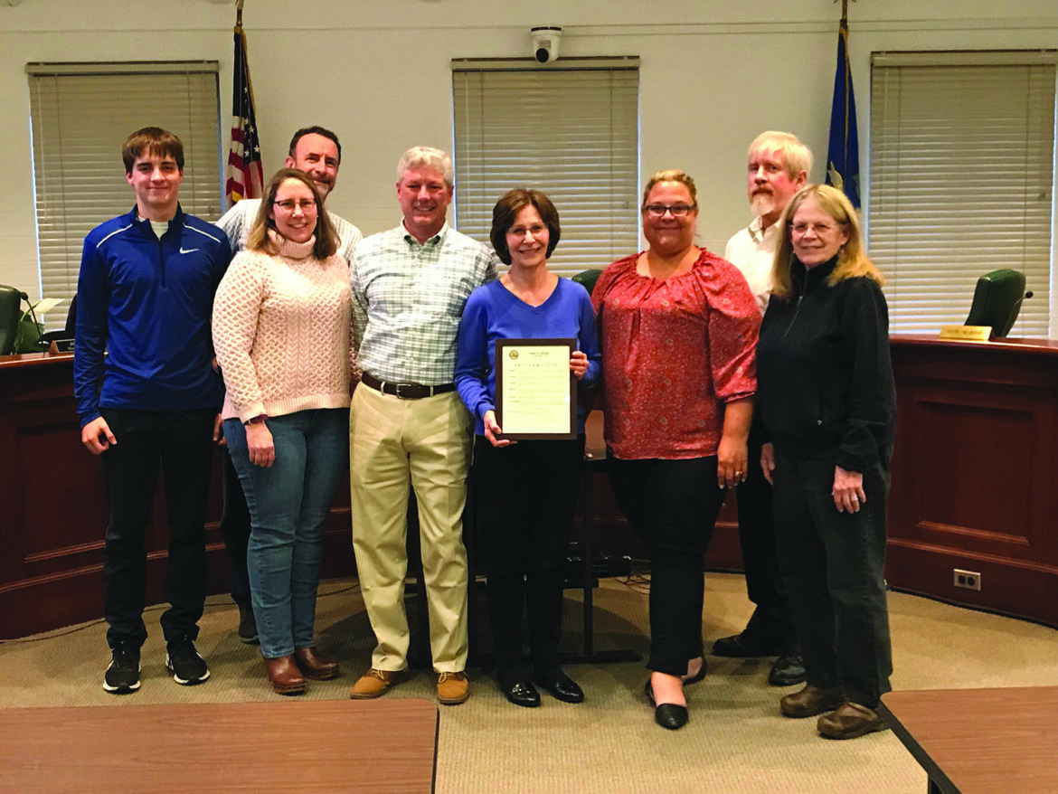 Karen Hazen recently retired after serving 15 years as the Granby Town Clerk. On April 18, she was presented with proclamations from the Board of Selectmen and the Connecticut General Assembly. From l.: John Bell, student representative; Selectmen Kelly Rome and Fred Moffa; First Selectman Mark Fiorentino; Karen Hazen; Town Manager Erica Robertson; and Selectmen Mark Neumann and Sally King. Congratulations to Karen on her retirement! Photo by Betsy Mazzotta