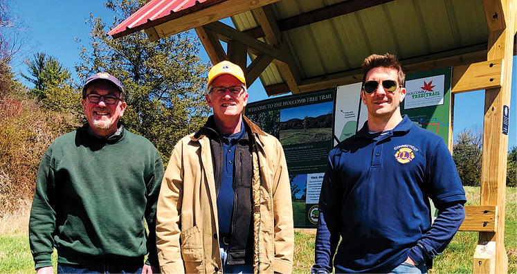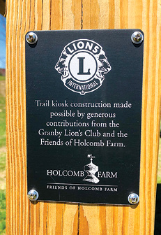 On Earth Day, April 22, the Friends of Holcomb Farm formally dedicated the Tree Trail Kiosk, made possible through a donation from the Granby Lions Club. Tree Trail volunteers welcomed Lions Club members to thank them for the club’s generous contribution to the construction of the kiosk. Above, from left, Lions Paul Keary, John Spatcher and Nick Watson. Right, the plaque honoring the Lions Club. Photos by Shirley Murtha