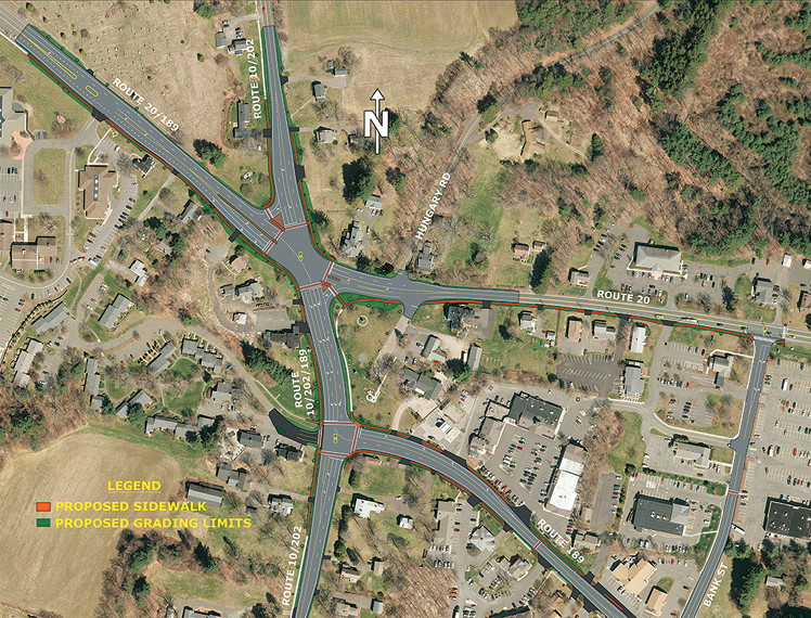 Social media reports to the contrary, there is no roundabout in the future for the center of Granby. The plan above shows the widened roads and increased lanes of traffic, all designed to ease the traffic congestion currently experienced, particularly during commuter hours. Source: State of Connecticut Department of Transportation.