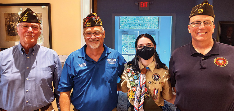 On June 8 the Simsbury Metacomet VFW Post 1926 members congratulated Kate Hollister of BSA Troop 1175 for winning the VFW Eagle Scout of the Year award. Recently graduated from Granby Memorial High School, Kate joined the troop when it was founded in February 2019. The troop now has 27 female scouts. She was awarded first place at the State VFW Convention on June 11 and now holds the distinction as the first female Scout to earn this award at the state level. Kate’s Eagle Scout project was creating portable indoor herb gardens for the Simsbury Senior Center. Kate will attend The College of Wooster in Ohio to study clinical psychology. With Kate are from l.: John Fox, past post commander and scout chairman; Lee Wilson, post commander; and Peter Van Loon, scout chairman. Photo courtesy of VFW Post 1926