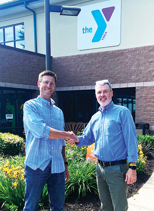 Jason Levesque, principal of Jason E. Levesque Construction of Barkhamsted, presents a $2,500 donation to Brian Liss, executive director of the Farmington Valley YMCA on May 26. Levesque is the builder for Harness Way on West Granby Road. Submitted photo