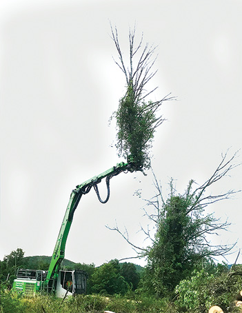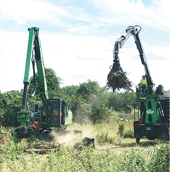 The Sennebogen 718E, a tracked vehicle, cost $1.75 million according to Nikitas. It has a 44-foot articulated boom with a claw and a saw, which can grab the tree trunk, cut it, and then lower it to the ground. The operator sits in a cab, protected from falling limbs. Sennebogen operator Austin Pike spent an entire day and part of the next day cutting down the ash trees as well as several dead junipers which had been strangled by bittersweet vines.