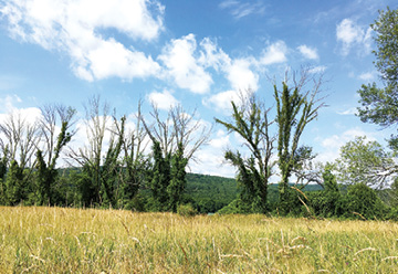 For at least the past 20 years, ash trees have been suffering from a bacterial disease called ash yellows. The disease affects the trees’ vascular system, resulting in substantial dieback and premature death. This usually takes two to ten years. More recently, the emerald ash borer, a rather pretty green beetle from Asia, has also attacked some of the ashes. The evidence of borer infestation is the unusual blonding of the bark, caused by woodpeckers eating the beetle larvae under the bark. Together, the ash yellows infection and the ash borers killed most of the hedgerow ash trees; only a few still showed some leaves. All of these trees were covered with invasive Oriental bittersweet vines which can grow to 60 feet. More important, however, were that dead ash limbs—some six inches in diameter—would fall without warning and land on the mowed paths. The FOHF put up hazard warning signs a couple of years ago directing walkers not to walk under the trees and relocated the mowed path further from the trees.