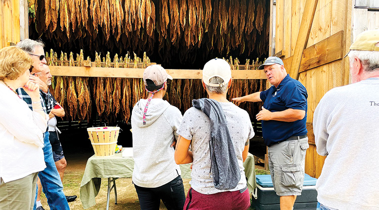 John Coward explains the use of his farm’s tobacco leaves, hung to dry in the big barns.