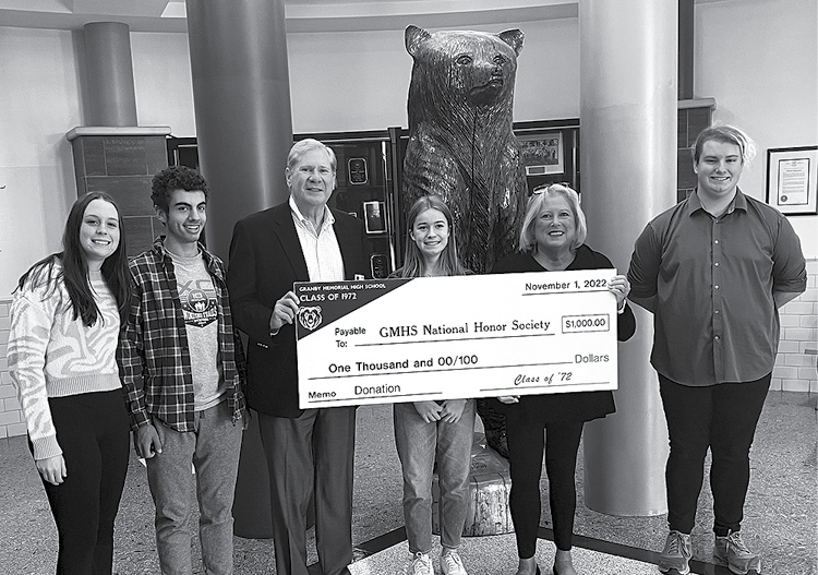As part of its 50th reunion, the GMHS class of ‘72 was given a tour of the high school by students from the National Honor Society. To thank them for their efforts, the class donated $1,000 to the student scholarship fund on Nov. 3. “In high school, if it didn’t have to do with basketball, I was simply not interested. Today, I’m thrilled to see young people who are serious about academics,” said Bob Bazyk who helped coordinate the reunion. “I’m so glad that the Class of 1972 was able to donate toward the National Honor Society Scholarship Fund at our outstanding high school,” said Barbara Molton Guarco, treasurer for the reunion. From l.: Jacquie Thibodeau, Ben Weber, Bob Bazyk, Evelyn Danke, Barbara Guarco, Cole Max. Submitted photo