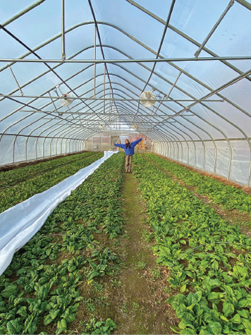 Melody Smith, a member of our awesome Farm Crew, celebrates the bountiful winter spinach crop. Photo by Caleb Logan