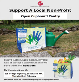 Open Cupboard Pantry was selected as the February beneficiary of the program by store leadership at the Big Y at 195 College Highway in Southwick. Open Cupboard Pantry will receive a $1 donation every time the $2.50 reusable Community Bag is purchased at this location during February, unless otherwise directed by the customer through the Giving Tag attached to the bag.