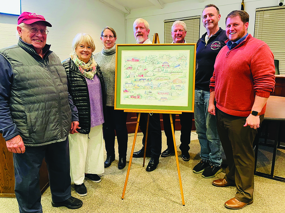 Longtime Granby residents Don and Marty Wilmot and Sally Markey gifted the town with two significant pieces of art at the Nov. 6 Board of Selectmen meeting. The Wilmots presented a large print of a painting by Jane C. Lowerre that depicts 32 buildings and scenes from around Granby.